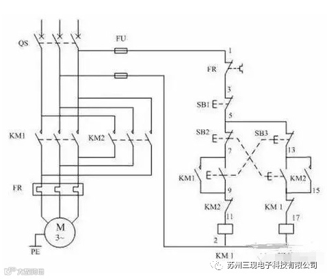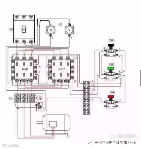 2、按下正向启动按钮SB3,KM1通电吸合并自锁,主触头闭合接通电动机,电动机这时的相序是L1、L2、L3,即正向运行。