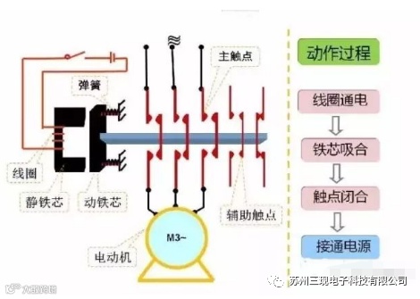 当线圈通电时,静铁芯产生电磁吸力,将动铁芯吸合,由于触头系统是与动铁芯联动的,因此动铁芯带动三条动触片同时动作,主触点闭合,和主触点机械相连的辅助常闭触点断开,辅助常开触点闭合,从而接通电源。