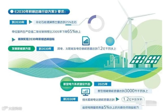 2021年国务院印发的《2030年前碳达峰行动方案》提出了非化石能源消费比重、能源利用效率提升,二氧化碳排放强度降低等主要目标。《方案》要求将碳达峰贯穿于经济社会发展全过程和各方面,重点实施能源绿色低碳转型行动、节能降碳增效行动、循环经济助力降碳行动、绿色低碳科技创新行动等“碳达峰十大行动”,并就开展国际合作和加强政策保障作出相应部署。