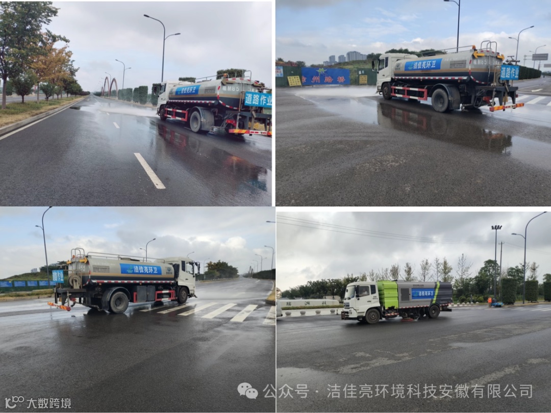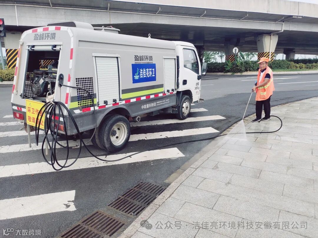 项目始终采用人机结合的清扫模式,一方面安排高压洗扫车进行全面清扫,洒水车对道路进行抑尘,垃圾清运车及时清除垃圾;另一方面,在每条道路安排4-5名环卫人员巡回保洁,对沿途公厕设施设备进行全面排查和保洁。