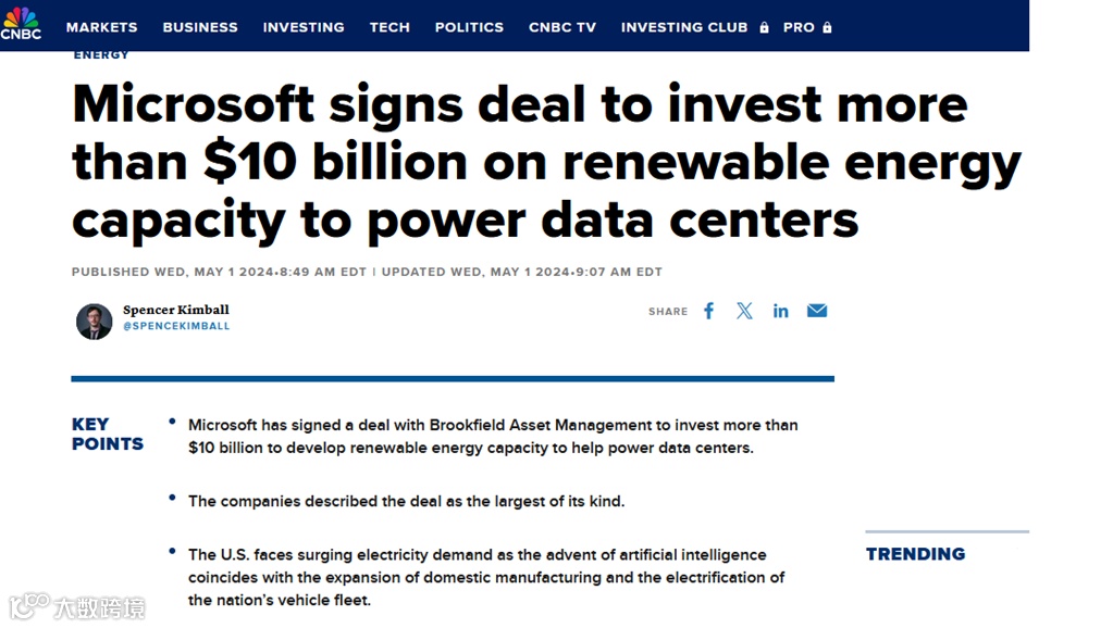 5月1日,微软(Microsoft)与布鲁克菲尔德资产管理公司(BrookfieldAssetManagement)宣布,双方已签署协议,将投资100多亿美元开发可再生能源发电能力,以满足人工智能和数据中心日益增长的需求。