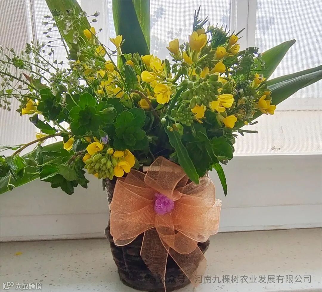 相信大家也都看清楚了,杯子里面装的花草就是我们常见的油菜花和荠荠菜花,紫色的小野花(我不知道这是什么花,但是地里常见)那几片绿色的大叶子是厨房门前种的蝴蝶花的绿叶。就这样简单的几样东西组合起来,就是一种美。让人不得不称赞大姐的手艺。