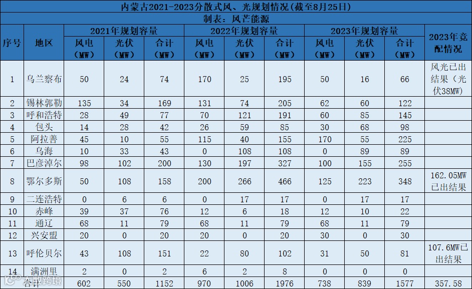 2021年6月,内蒙古能源局发布《内蒙古自治区分散式风电、分布式光伏发电项目三年行动计划(2021-2023年)》显示,2023年,内蒙古共规划738MW分散式风电指标,839MW分布式光伏指标。