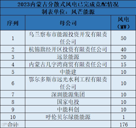 在已完成竞配的176MW分散式风电项目中,乌兰察布市能源投资开发有限责任公司拿到的指标最多,为50MW;杭锦旗经开区投资有限责任公司拿到的指标次之,共计40MW。