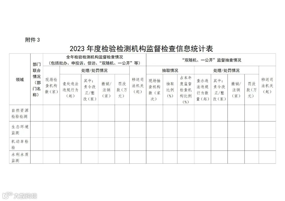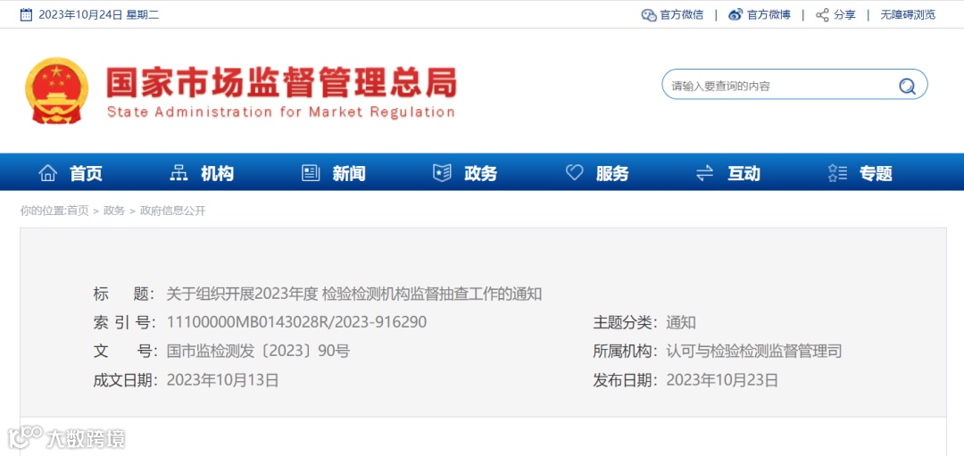 为进一步强化检验检测市场监管,推进检验检测行风建设,市场监管总局、公安部、自然资源部、生态环境部、交通运输部、水利部、海关总署和国家药监局决定于2023年10月至11月中旬在全国范围开展检验检测机构“双随机、一公开”监督抽查。现将有关事项通知如下: