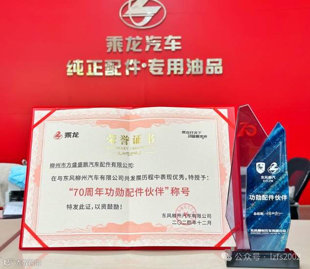 2024年,受房地产行业和基建项目影响,商用车市场持续低迷,在这样艰难的环境下,我公司业务团队不畏艰难,以决战决胜的精神状态,全力以赴冲刺各项目标任务,最终获得不俗的成绩,荣获东风柳汽授予2024年度“市场拓展先锋奖”、“行业客户营销奖” ;盛鹏配件公司荣获东风柳汽授予2024年度“优秀配件企业”、“70周年功勋配件伙伴”称号。
