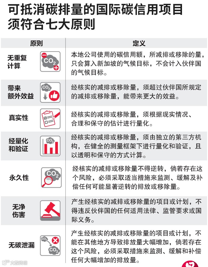 2024年起,须缴碳税的本地企业可从国际市场购买高质量的碳信用,以抵消最多5%的可征收碳排放。获准的国际碳信用项目须满足政府设定的七大原则。