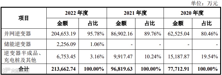 2022年,爱士惟储能逆变器量产并实现销售,当年储能逆变器实现收入2,256.09万元,占总收入比重1.06%。主营业务收入按产品类别如下: