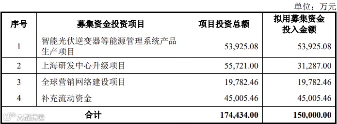 本次预计募资15亿元,其中5.39亿元用于智能光伏逆变器等能源管理系统产品生产项目,3.13亿元用于上海研发中心升级项目,1.98亿元用于全球营销网络建设项目,4.5亿元用于补充流动资金。