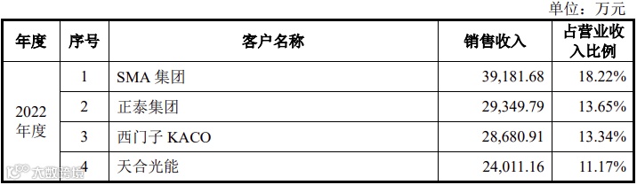 其中爱士惟对前五大客户SMA集团、正泰集团、西门子KACO、天合光能、中来股份的销售收入占营业收入的比例分别为18.22%、13.65% 、13.34%、11.17%和9.31%,客户集中度相对较高。