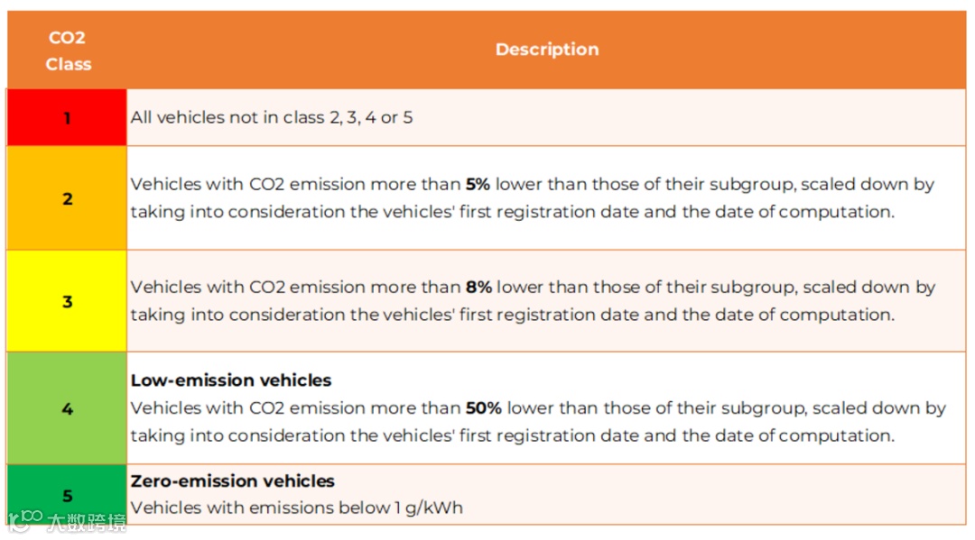在新的收费标准中,车辆收将按C02排放等级分类,分为1至5级(1级最差、5级最好)。除非车辆是零排放或者满足欧六排放的新车型,否则在2019年7月1日之前注册的车辆将自动被归类为C02排放等级1。