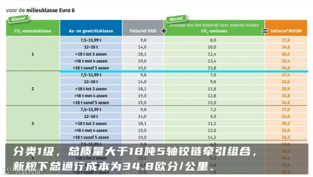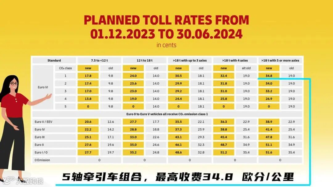 正如上图所示,我们以一辆被划分到收费等级1的车辆为例,挂车组合为5轴,过去的通行费每公里为19欧分,加上最新的碳排放附加费15.4欧分后,单公里的总费用来到了34.8欧分,折合人民币2.69元每公里。如果是车太老,被划分到“1级”,通行费将直接增加83%左右。