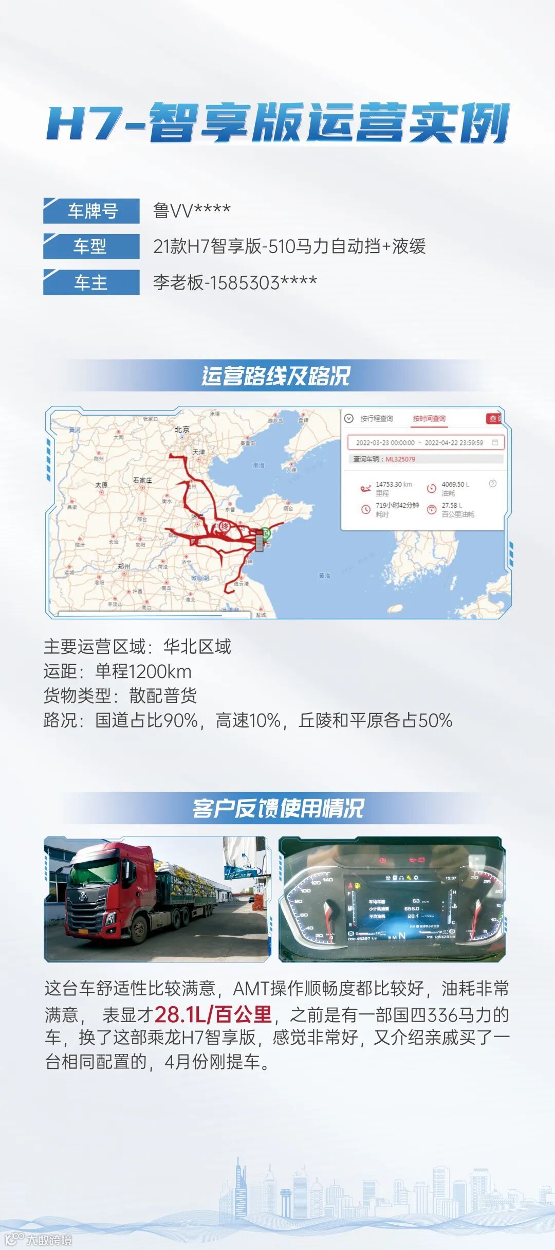 选择了乘龙H7智享版的李老板,跑1200km的长途运输后,油耗才28.1L/百公里!乘龙H7智享版搭载的是13L大排量480-530马力发动机,动力强劲、起步快、提速快、运输效率更高。与此同时,整车采用轻量化、科学优化设计,应用高强度材料,降重不降质,全车更轻250kg以上,为运输货物提供更多装载空间,真正实现低油耗、高效率的全新硬核出行!