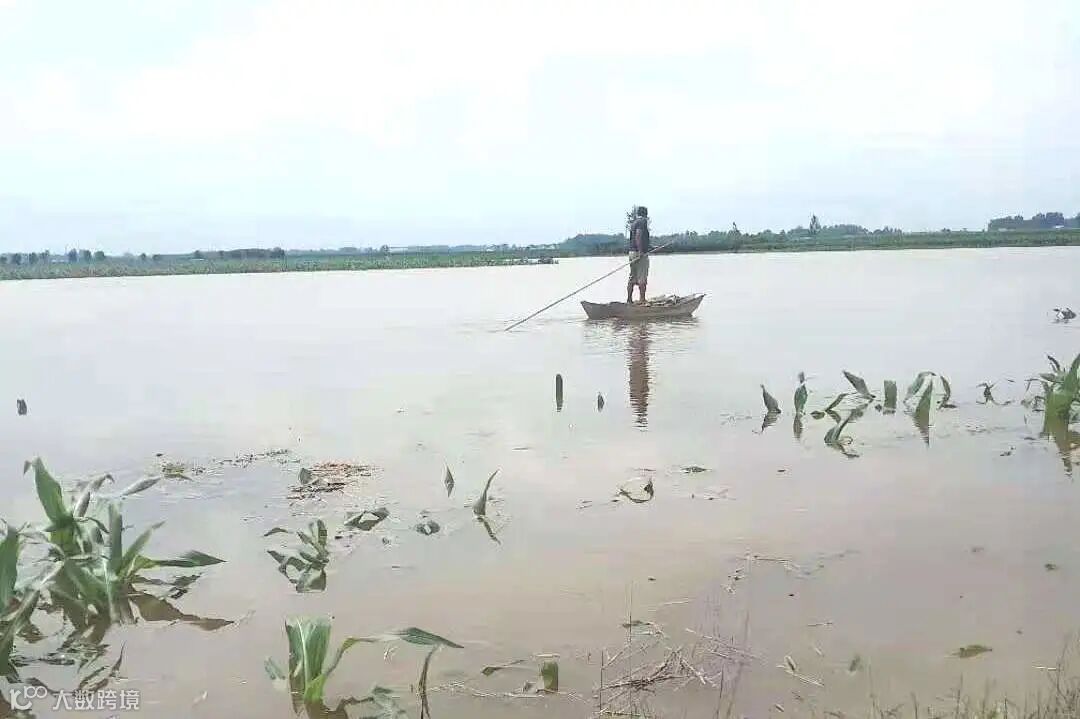因为接连几天的大雨使周围村民的田地都遭了殃,玉米苗被雨水埋的不见影子。农民伯伯只得坐船看着这一片片被淹没的田地,却又无可奈何。