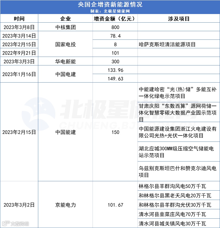 据统计,近期,中核集团、国家电投、华电新能、中国电建、中国能建、京能电力6家央国企发布增资新能源的计划。