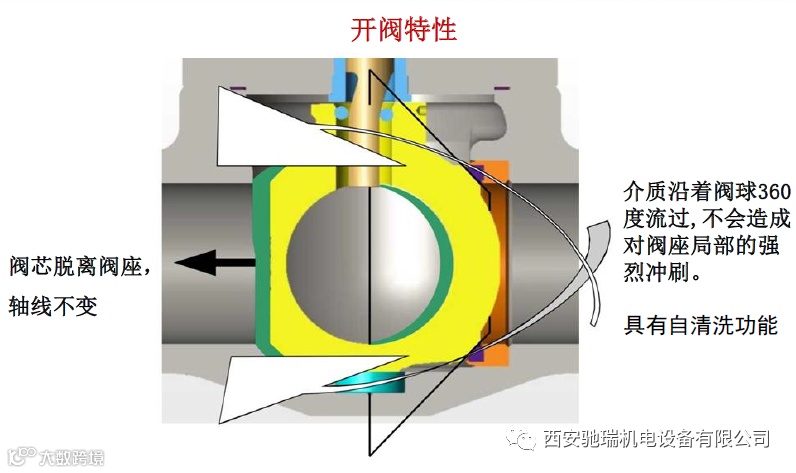 在开启阀门或关闭阀门的瞬间,阀球与阀座360度整体脱离接触或接触,使阀门在开关过程中无高速流体局部冲蚀阀座密封面,从而进一步提高了阀门的密封寿命。同时当阀球脱离阀座时,流体沿密封面360度将外来杂质冲洗干净,阀门具有自清洗作用。