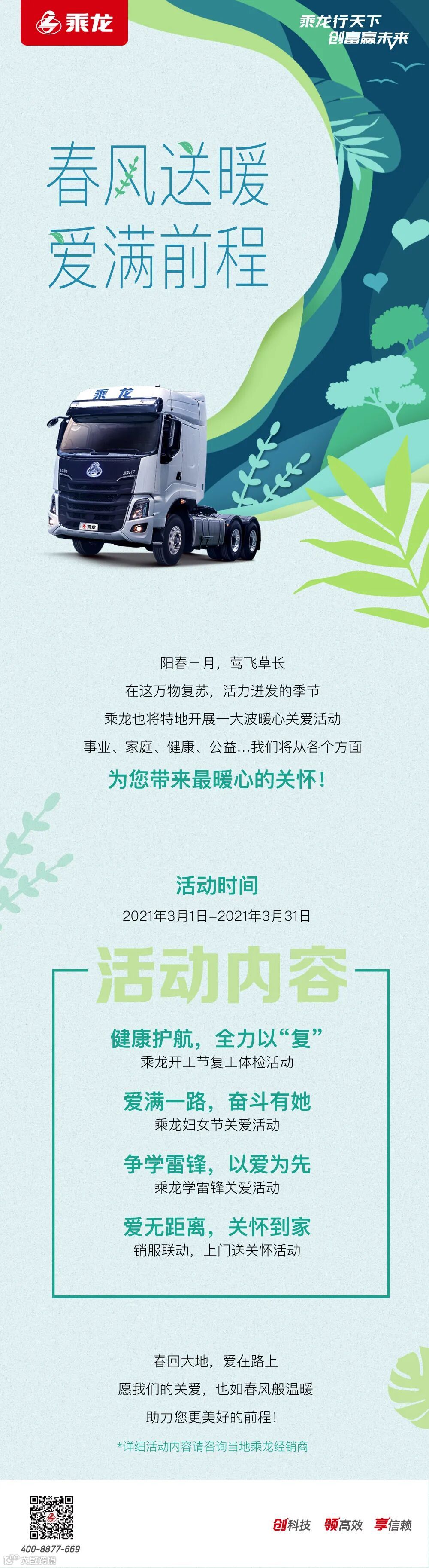 关爱卡友,助力卡友安心赚钱、用车无忧,是乘龙义不容辞的社会责任。为了给卡友带来更多超值的关怀与保障,为卡友们的牛年创富征途保驾护航,除了更高品质的产品之外,乘龙又再度携手四大客户关怀活动来袭,以实际行动为乘龙卡友提供生活、家庭、健康、车辆等多个方面的关怀!