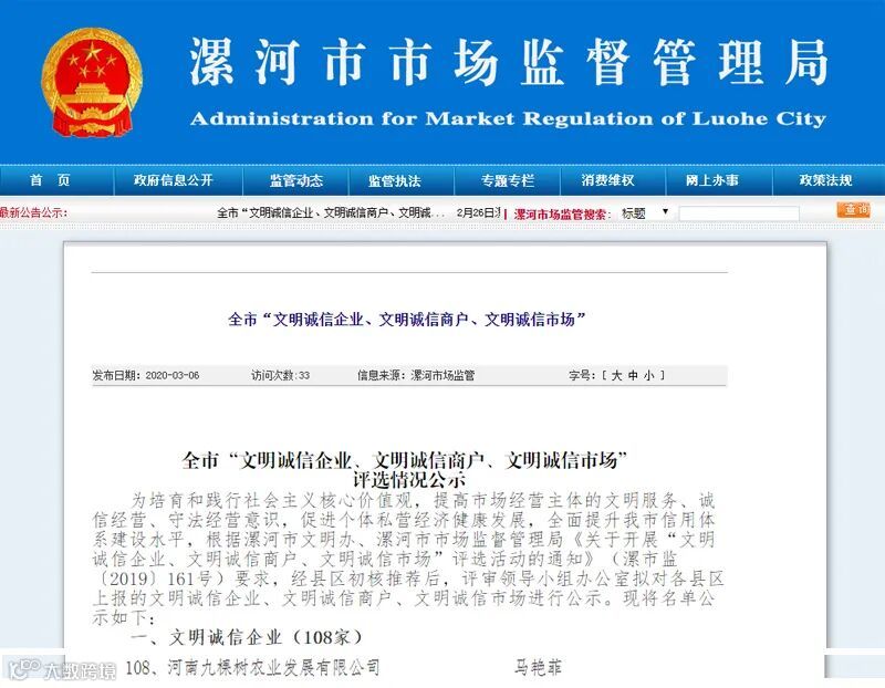 2020年3月6日,漯河市文明办、漯河市市场监督管理局对2020年度漯河市“文明诚信企业、文明诚信商户、文明诚信市场”进行了公示。河南九棵树农业发展有限公司荣获“文明诚信企业”荣誉称号。