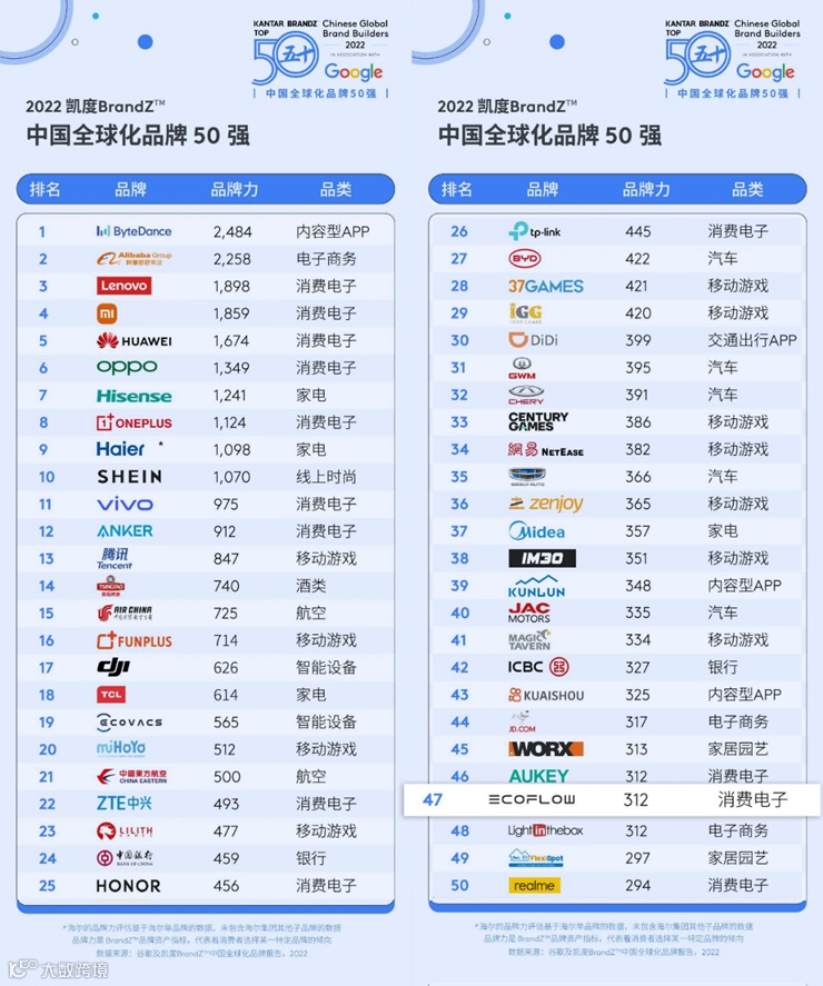 7月27日,Google谷歌携手凯度发布《2022 凯度BrandZ™中国全球化品牌50强》榜单,正浩EcoFlow作为新晋品牌首次上榜,排名第47位(消费电子品类中排名第12位),移动储能技术实力与品牌成长力受全球市场认可。同时入选榜单的还有小米、华为、OPPO等中国知名科技品牌。