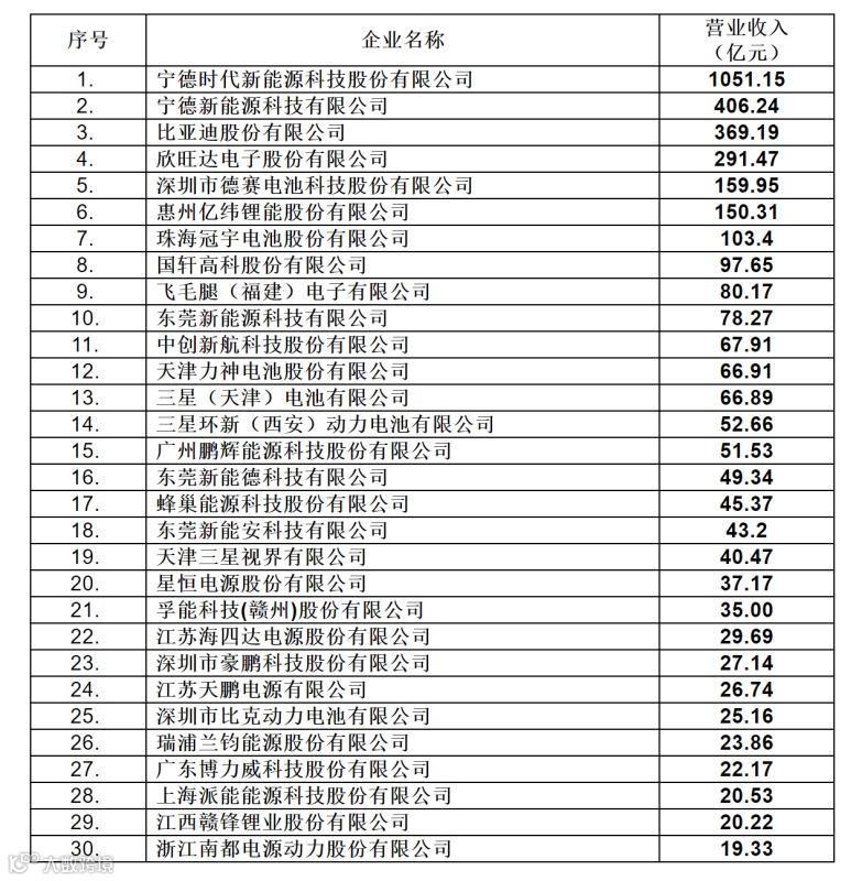 按照营业收入(仅统计锂离子电芯及动力用、消费类产品用和储能用锂离子电池模组或系统)排序,30家企业2021年营业收入为3559亿元。其中,宁德时代新能源科技股份有限公司以1051亿元营业收入位居第一,宁德新能源科技有限公司以406亿元营业收入排名第二,比亚迪股份有限公司以369亿元营业收入排名第三。30家锂离子电池企业名单如下: