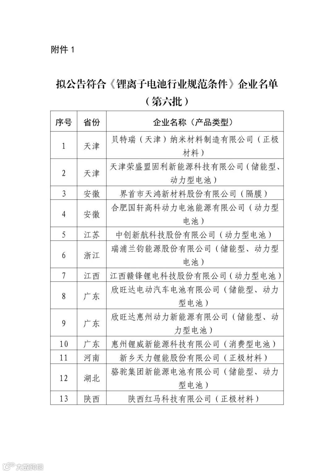 1.拟公告符合《锂离子电池行业规范条件》企业名单(第六批)