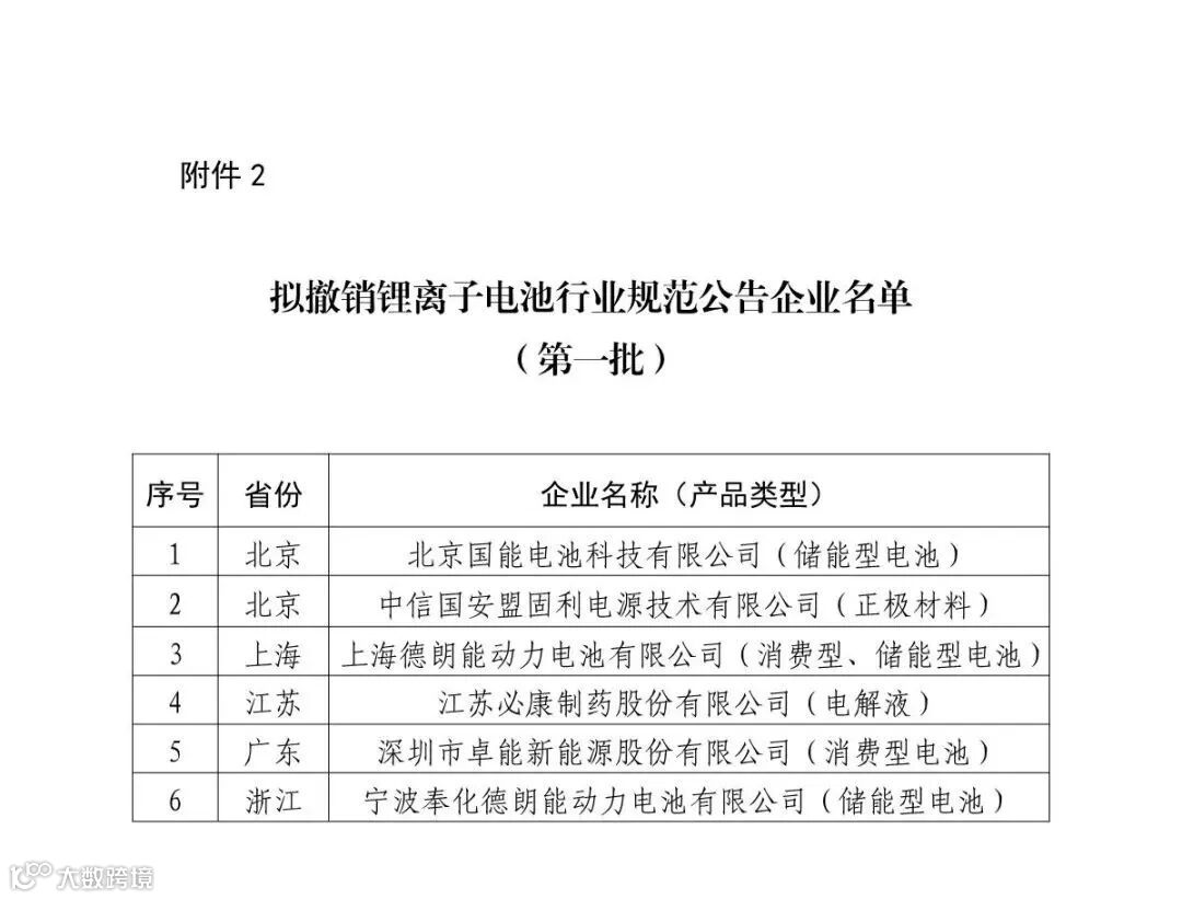 北京国能电池科技有限公司等6家已公告企业,因不能保持规范条件要求,拟撤销其规范条件企业名单,一并予以公示(见附件2)。