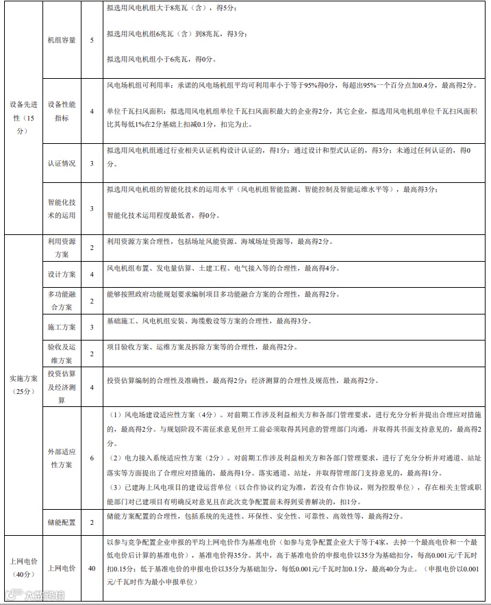 专家评审采用综合评分法,主要包括企业能力(20分)、设备先进性(15分)、实施方案(25分)、电价水平(40分)等竞争要素。详细评分指标和分数权重详见附表。