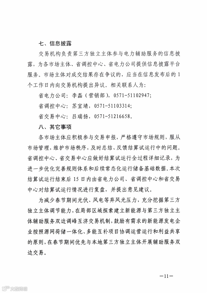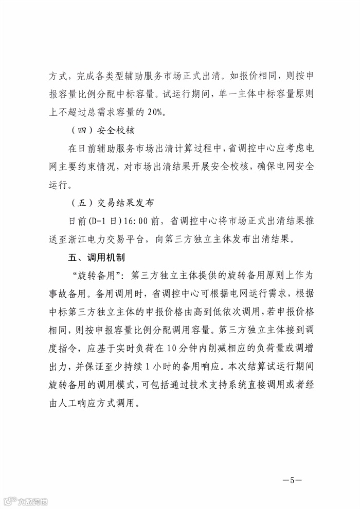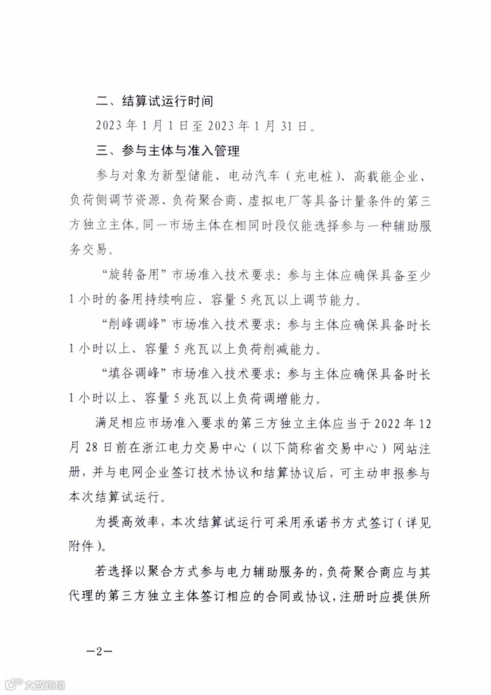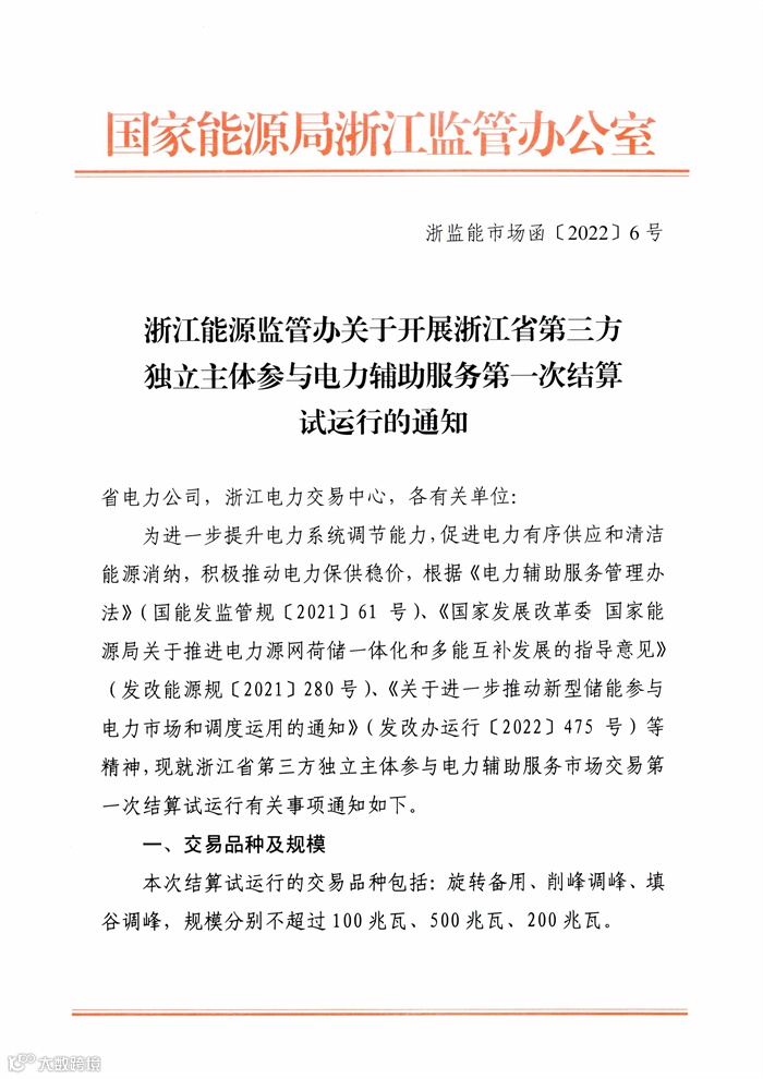 日前,浙江能监办发布关于开展浙江省第三方独立主体参与电力辅助服务第一次结算试运行的通知。文件指出,本次结算试运行的交易品种包括:旋转备用、削峰调峰、填谷调峰,规模分别不超过100兆瓦、500兆瓦、200兆瓦。