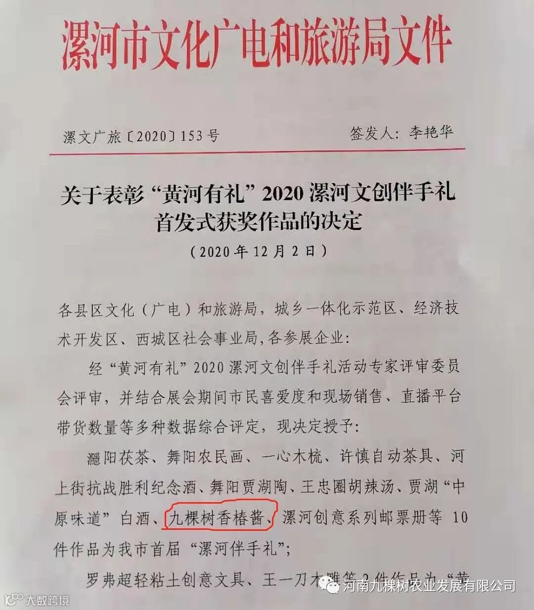 今天上午“黄河有礼”2020漯河文创伴手礼首发式获奖作品表彰大会在漯河市文化旅游广电总局举办,一共有10件作品被选为我市首届“漯河伴手礼”,九棵树香椿酱荣幸当选。