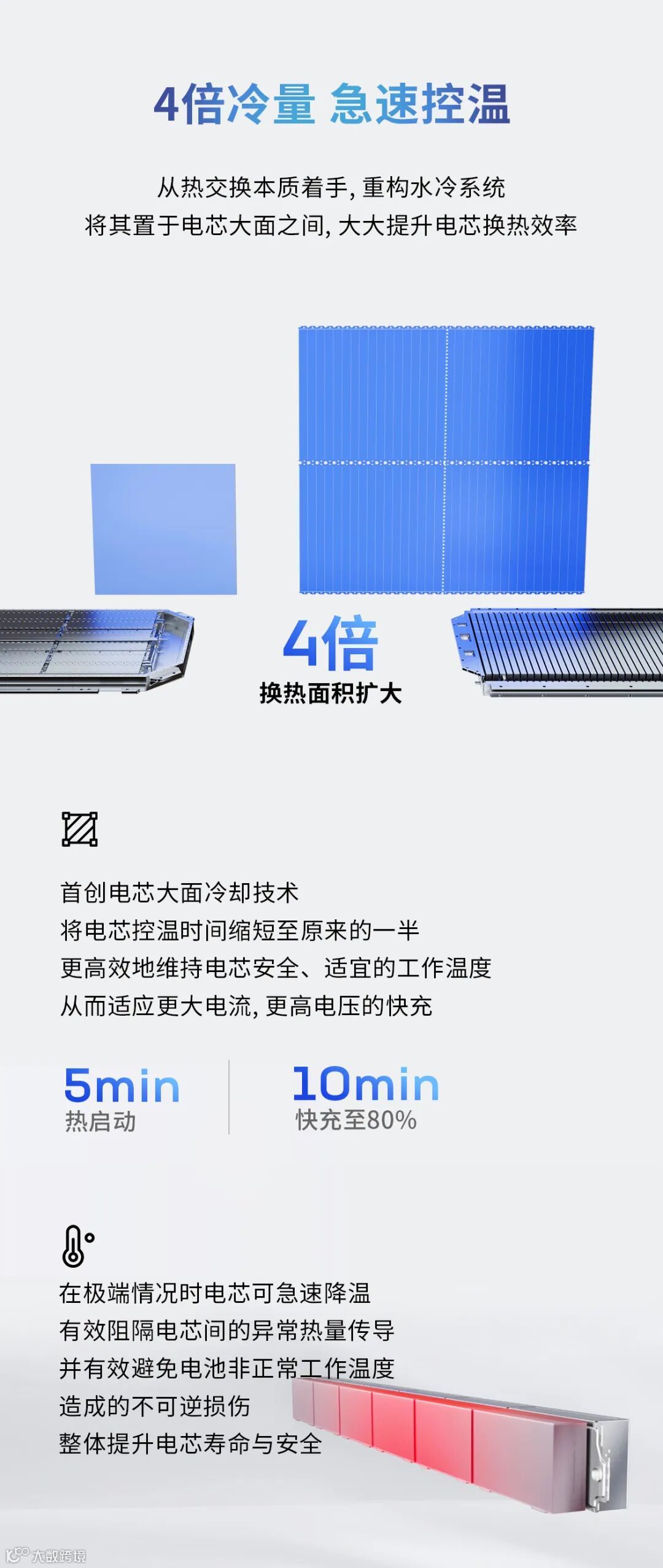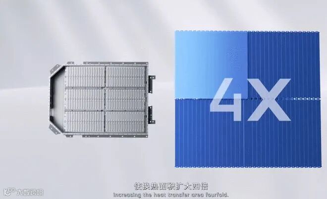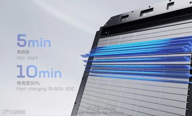 据介绍,通过全球首创的电芯大面冷却技术,麒麟电池支持5分钟快速热启动及10分钟快充。在相同的化学体系、同等电池包尺寸下,麒麟电池包的电量,相比4680系统提升13%。