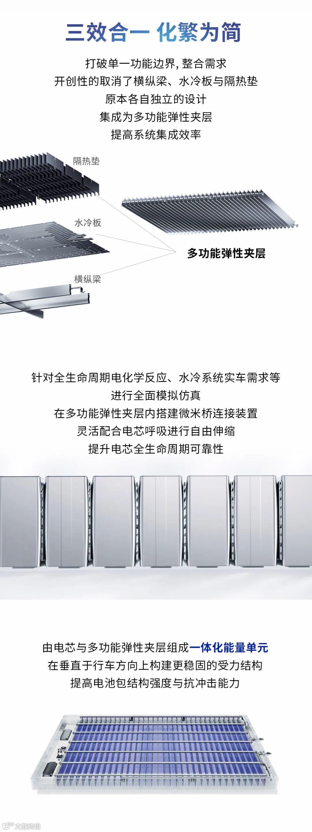 不仅如此,由电芯与多功能弹性夹层组成一体化能量单元。在垂直于行车方向上构建更稳固的受力结构,提高电池包结构强度与抗冲击能力。