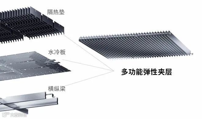 宁德时代指出,CTP3.0 麒麟电池开创性地取消了横纵梁、水冷板与隔热垫原本各自独立的设计,集成为多功能弹性夹层,提高系统集成效率。