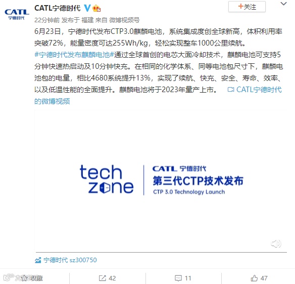 6月23日消息,今日,宁德时代正式发布CTP3.0麒麟电池,系统集成度创全球新高,体积利用率破72%,能量密度可达255Wh/kg,可实现整车1000公里续航,将于2023年量产上市。