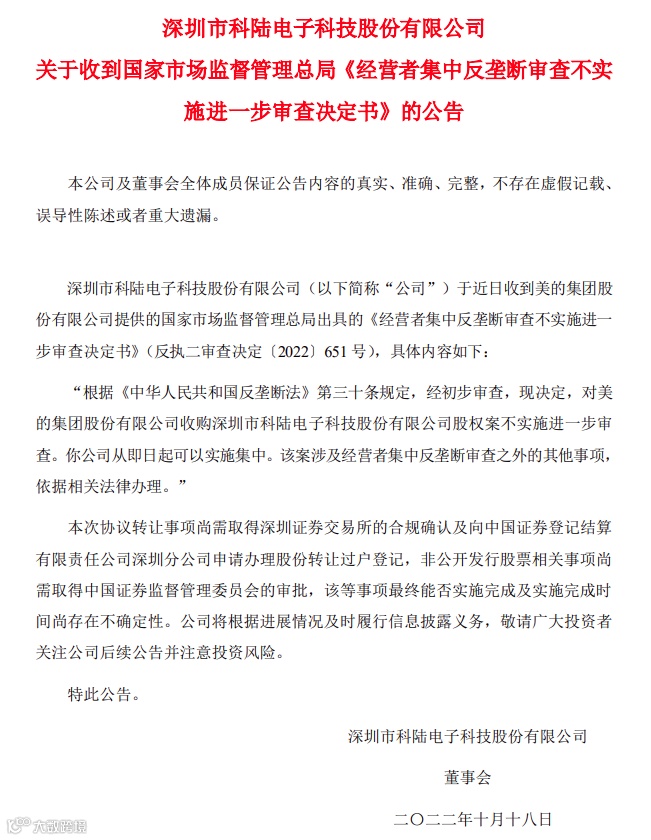 公告显示,科陆电子于近日收到美的集团股份有限公司提供的国家市场监督管理总局出具的《经营者集中反垄断审查不实施进一步审查决定书》,具体内容如下: