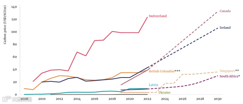 碳税价格在2021年和2022年初也有所上涨,涨幅比碳排放交易系统低一些。碳税在2020年比较稳定,2021年大约上涨了6美元/每吨二氧化碳,而在2022年4月1日,又上涨了5美元/每吨二氧化碳。与去年相比,大多数碳税管辖区都提高了碳税率。相比其他国家和地区,不列颠哥伦比亚省、爱尔兰、拉脱维亚、列支敦士登、南非、瑞士和乌克兰的国内碳税率最高。