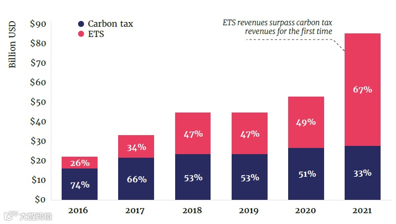 由于碳价的提高,2021年碳收入急剧上升,这也是第一次碳排放交易系统的收入超过了碳税收入。