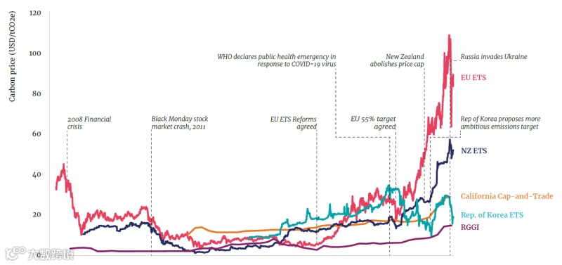 2021年,多个碳排放交易系统的碳定价都达到历史新高。欧盟、瑞士、加利福尼亚和魁北克,新西兰的碳排放交易市场都达到了历史最高价,英国价格自2021年年中开始增幅很快,中国市场,2021年末碳价格下跌,但2022年初碳价格有所回升。