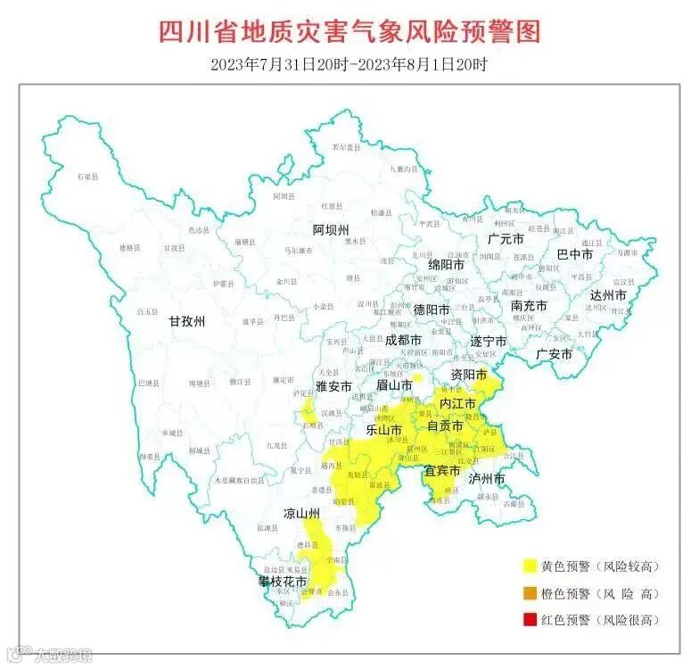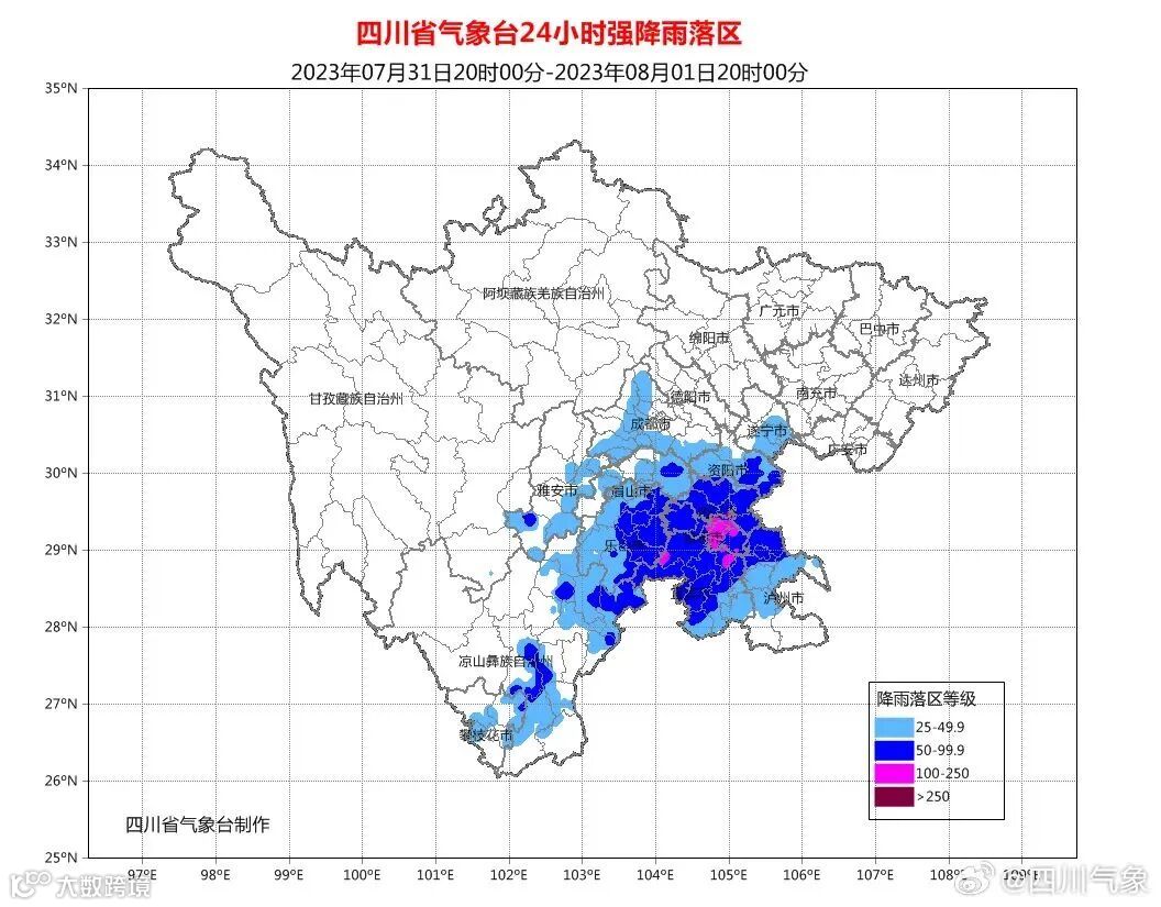 7月31日20时到8月1日20时:我省有一次雷阵雨天气过程,雷雨时伴有短时阵性大风,其中宜宾、自贡、内江、乐山4市和资阳、眉山2市东部以及泸州北部的部分地方有暴雨(雨量50~80毫米),局部地方有大暴雨(雨量100~130毫米),个别站点可超过150毫米,最大小时雨量40~70毫米。另凉山州东北部、中南部有大雨到暴雨(雨量30~70毫米)。