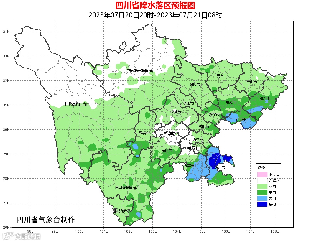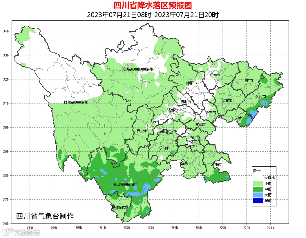 盆地大部多云间阴有阵雨或雷雨,其中达州、南充、广安、宜宾、泸州5市和雅安、乐山2市南部有中到大雨,局部暴雨;川西高原多云间阴有阵雨或雷雨,其中甘孜州南部东部有中雨;攀西地区多云间阴有阵雨或雷雨,局部地方有中到大雨。