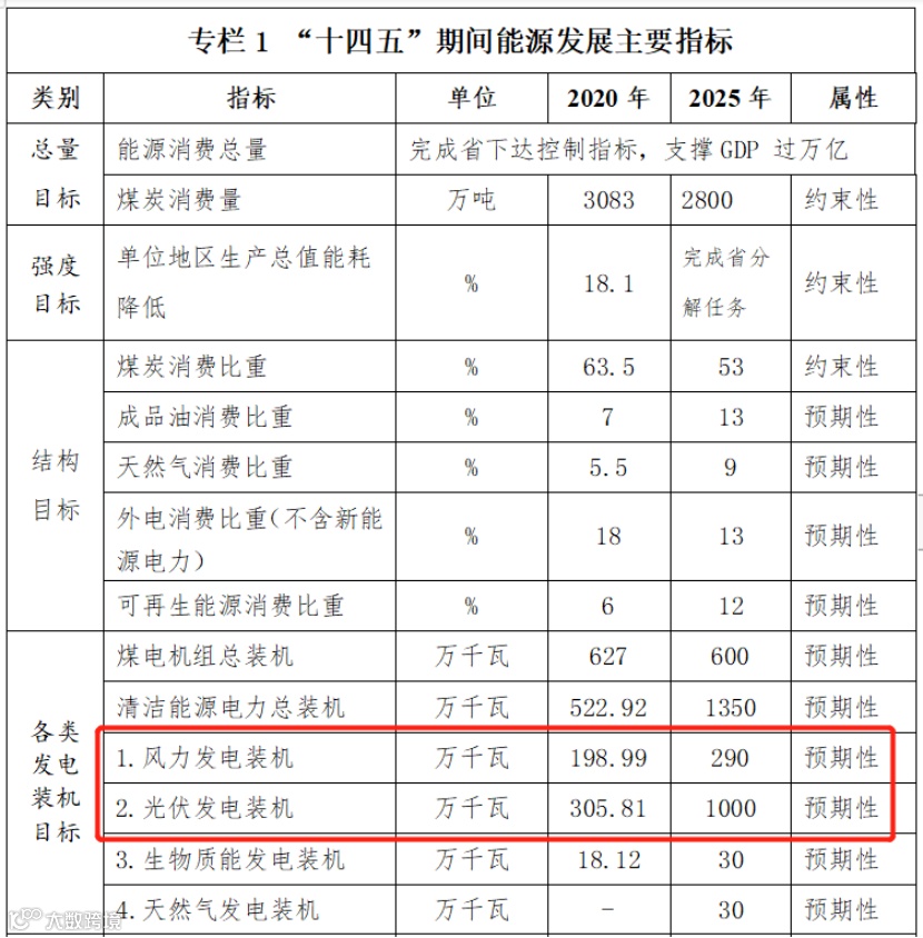 潍坊市“十四五”能源规划(意见稿)要求:到2025年,可再生能源电力装机总容量达到1300万千瓦以上,力争达到1500万千瓦以上。其中,到2025年,光伏发电装机规模达到1000万千瓦以上;力争风电装机容量290万千瓦以上。相较于2020年新增6.94GW光伏、0.91GW风电。