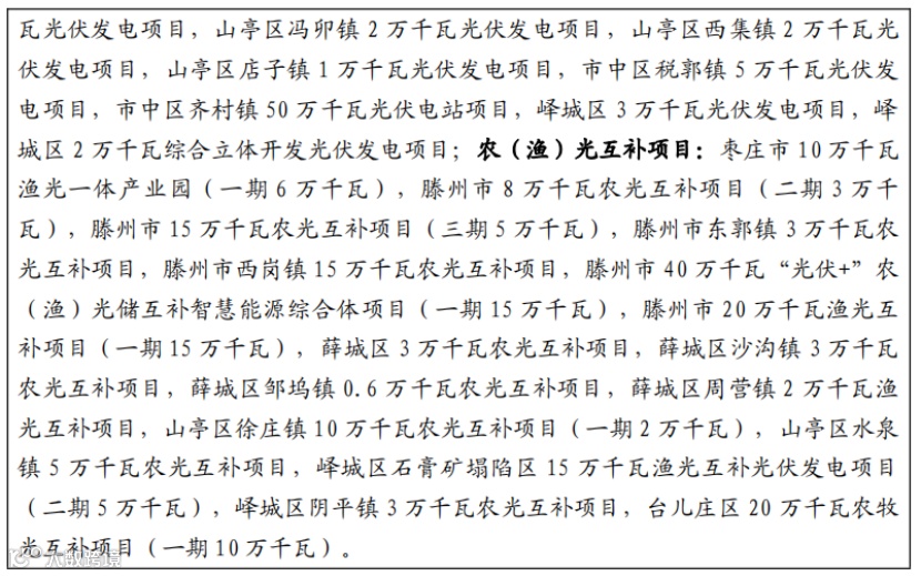 光伏发电方面,鼓励资金雄厚、合作意愿强烈、口碑较好的重点企业,充分利用滕州西部煤矿塌陷区、峄城东部石膏矿塌陷区、水库、坑塘水面等资源,灵活采用农光互补、渔光互补等模式,因地制宜布置打桩固定式、漂浮式光伏电站,大力发展光伏+农业、光伏+渔业;拓展多种光伏应用场景,充分发挥我市产业技术规模优势,探索“光伏+锂电储能+空气源热泵”“光伏+制氢”“光伏+锂电储能+通信基站”“光伏+锂电储能+车棚/停车场”等“光伏+”模式,推动光伏发电就地生产、就近消纳。