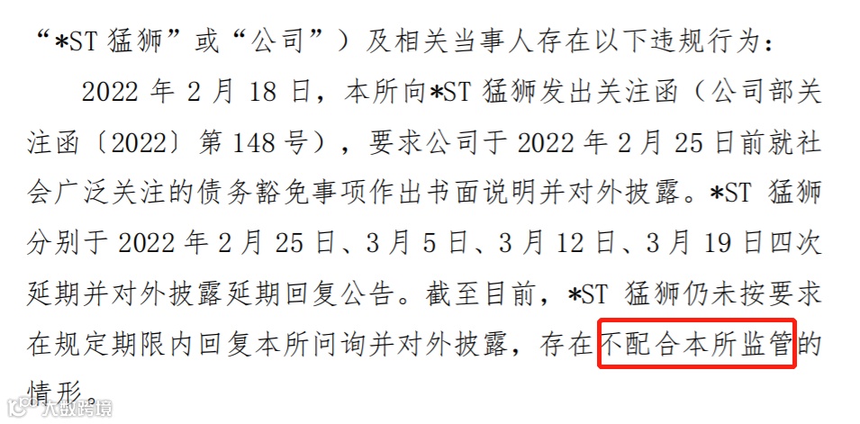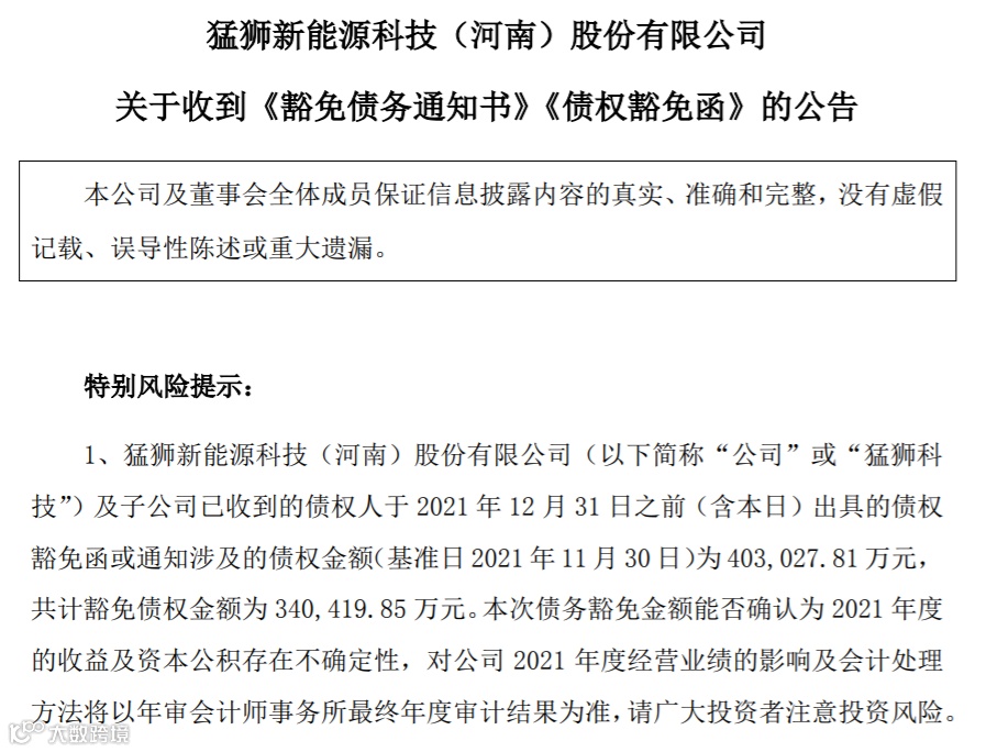 随后,1月18日,北京大成律师事务所公告称,接受猛狮科技的委托,就其债权人对其进行债务豁免事宜进行核查,表示完成了对公司以及十家债权人的访谈,逐项梳理事实并初步拟定法律意见。但部分法律尽职调查工作无法在短期内完成,本所律师暂不能形成相对完整的法律意见书并提交本所进行内核,导致无法按照深交所要求的时间出具法律意见。