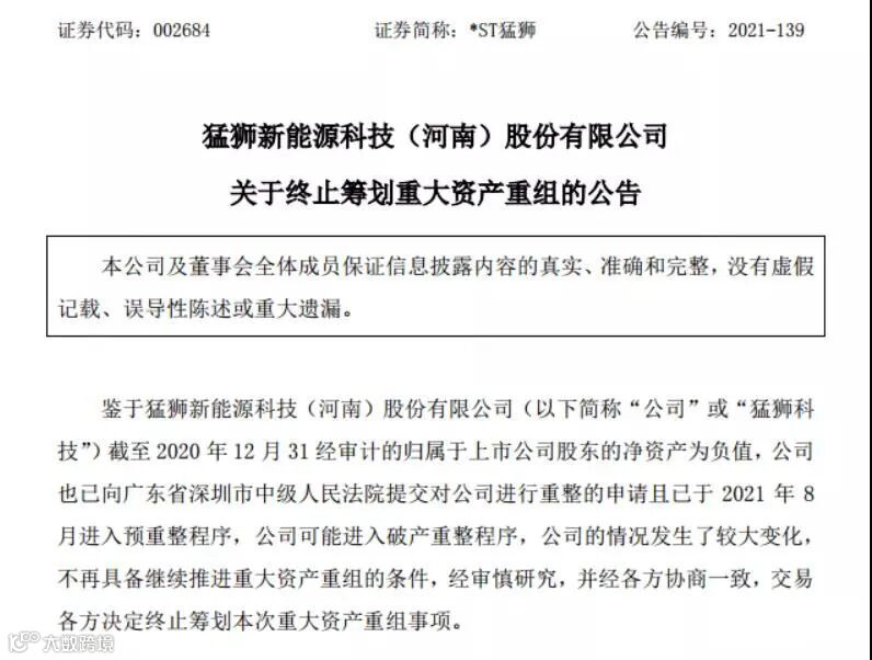 媒体消息,近日,*ST猛狮发布公告称,鉴于猛狮新能源科技(河南)股份有限公司截至2020年12月31日经审计的归属于上市公司股东的净资产为负值,公司也已向深圳市中级人民法院提交对公司进行重整的申请,且已于2021年8月进入预重整程序,公司可能进入破产重整程序,不再具备继续推进重大资产重组的条件。“经审慎研究,并经各方协商一致,决定终止与中建材两家子公司的重大资产重组事项。”
