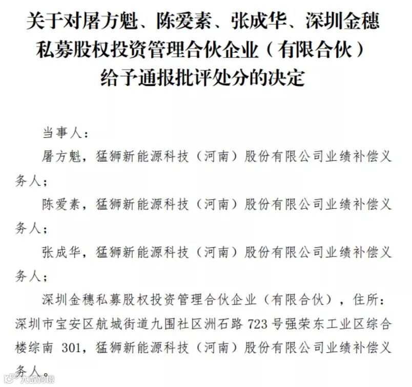 同日,深圳交易所还对屠方魁、陈爱素、张成华、金穗投资给予通报批评处分。原因是*ST 猛狮”于 2016 年通过发行股份的方式购买的华力特100%股权,当中有华力特2018年净利润不达标则补偿的补充协议。然而,原承诺的华力特2018年净利润不低于 13182 万元,实际却亏损11054.92 万元,未完成 2018年业绩承诺。截至目前,屠方魁、陈爱素、张成华、金穗投资仍未履行业绩补偿承诺。