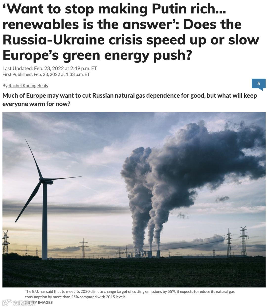 MarketWatch网站发表署名Rachel Koning Beals网站文章,题目是:‘Want to stop making Putin rich… renewables is the answer’: Does the Russia-Ukraine crisis speed up or slow Europe’s green energy push?(“想要停止让普京变得富有……可再生能源就是答案”:俄罗斯-乌克兰危机是加速还是减缓了欧洲的绿色能源发展?)