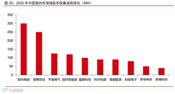 2020年,中国新增投运的电化学储能项目中,功率规模排名前十的储能系统集成商,依次为:阳光电源、海博思创、平高电气、国轩新能源、猛狮科技、科华恒盛、南都电源、科陆电子、南瑞继保和库博能源。
