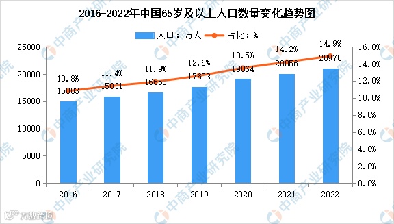 中国国家统计局相关人口数据显示,截至2021年底,全国60岁及以上老年人口达2.67亿,占总人口的18.9%;65岁及以上老年人口达2亿以上,占总人口的14.2%,我国已经正式步入老龄社会。据测算,预计“十四五”时期,60岁及以上老年人口总量将突破3亿,占比将超过20%,进入中度老龄化阶段。2035年左右,60岁及以上老年人口将突破4亿,在总人口中的占比将超过30%,进入重度老龄化阶段。老龄化加剧,老年人口基数不断增长,老年人的购买能力与老龄消费需求推动老龄产业快速发展,智慧养老行业市场规模扩大实为大势所趋。