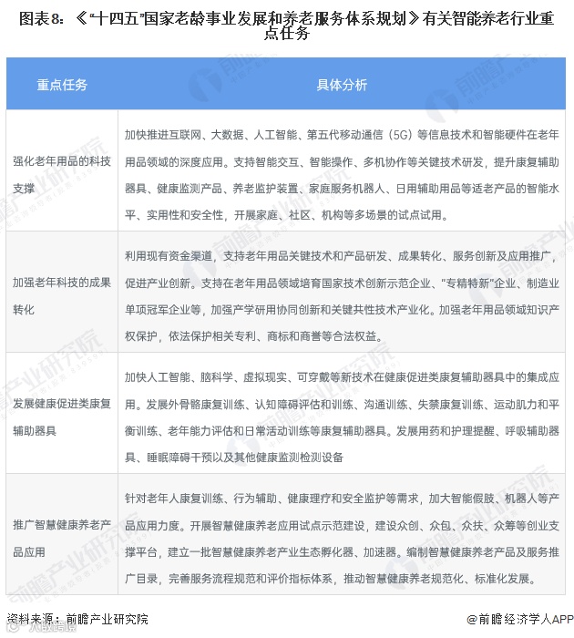 2022年1月,为实施积极应对人口老龄化国家战略,推动老龄事业和产业协同发展,构建和完善兜底性、普惠型、多样化的养老服务体系,不断满足老年人日益增长的多层次、高品质健康养老需求,国务院印发出台《“十四五”国家老龄事业发展和养老服务体系规划》,从整体上对智能养老行业进行规划布局,为其行业发展提供了更多的政策利好。其中指出,要强化养老等民生领域供需对接,进一步优化资源配置。在“互联网+”的时代背景下,推动养老服务信息数据化,打造更多快捷、高效、便利的适老化智能产品,使得现代信息技术真正方便老人、造福老人。