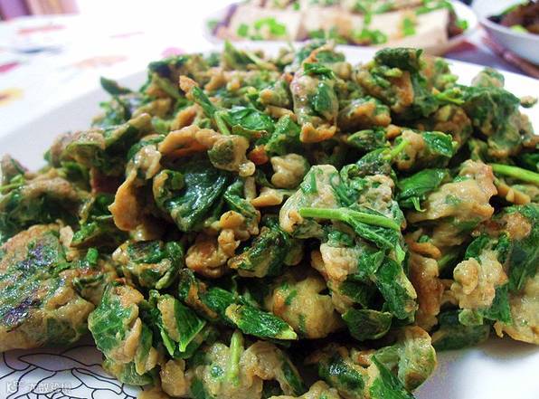 此时的香椿是极香的,爸爸娴熟地用竹竿敲着枝头,就有香椿头簌簌地掉下来。我跟在后头捡这绿油油的美味,想象着它们一会儿在蛋液中翻滚的诱人模样。这个季节的香椿头,色泽嫩绿,叶尖带着玛瑙红,味浓郁浑香,没有比这更适合炒鸡蛋的了。
