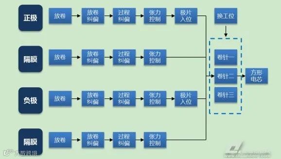 卷绕(所用设备:卷绕机)是将制片工序或收卷式模切机制作的极片卷绕成锂离子电池的电芯,主要用于方形、圆形锂电池生产。卷绕机可细分为方形卷绕机、圆柱卷绕机两类,分别用于方形、圆柱锂电池的生产。相比圆柱卷绕,方形卷绕工艺对张力控制的要求更高,故方形卷绕机技术难度更大。